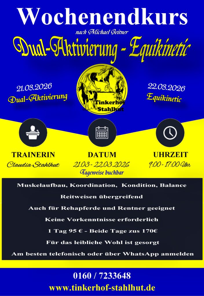 Dual Aktivierung – Equikinetic 21.03. – 22.03.2026 Muskelaufbau, Koordination, Kondition, Balance Reitweisen übergreifend. Auch für Rehapferde und Rentner geeignet. Keine Vorkenntnisse erforderlich 1 Tag 95 € – beide Tage zusammen 170€ Fürs leibliche Wohl wird gesorgt. Am besten telefonisch oder über WhatsApp anmelden
